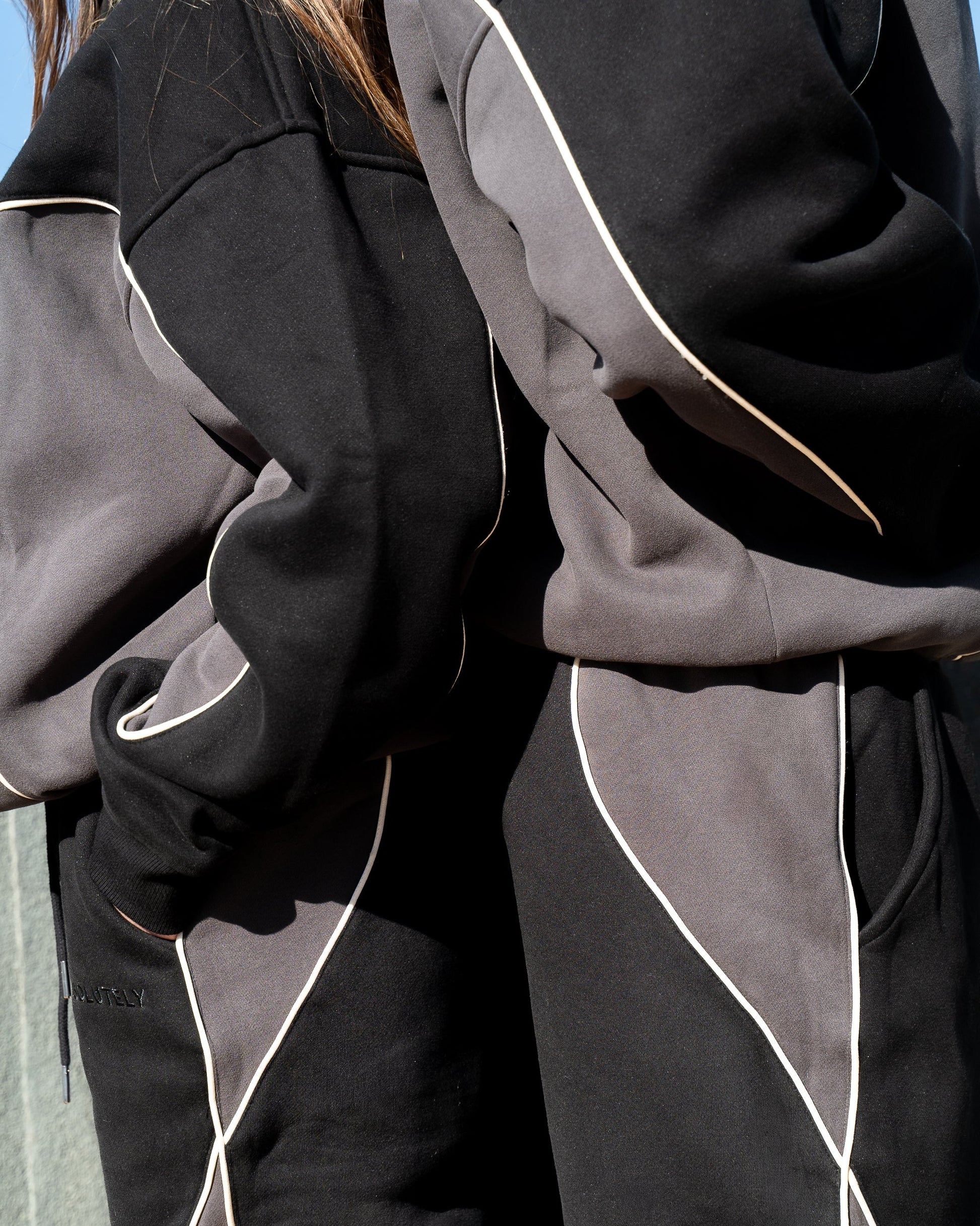 La modelo mide 1,60, y está usando polerón y pantalón talla S.